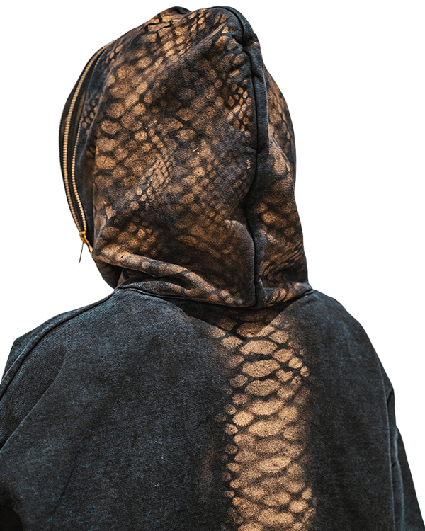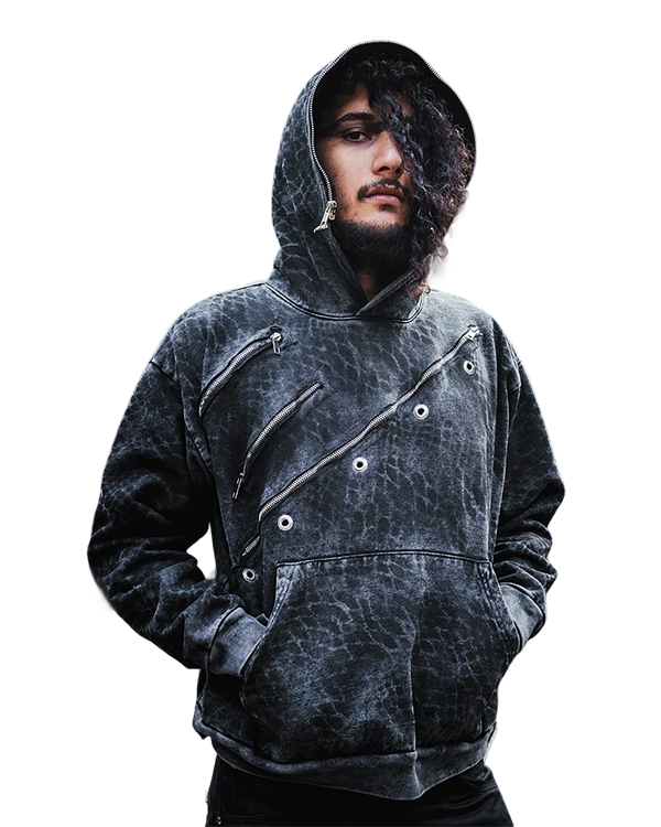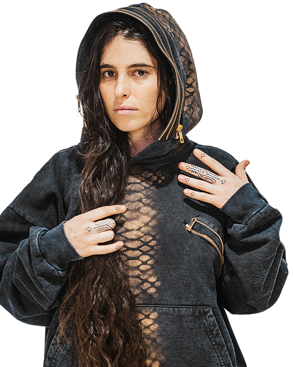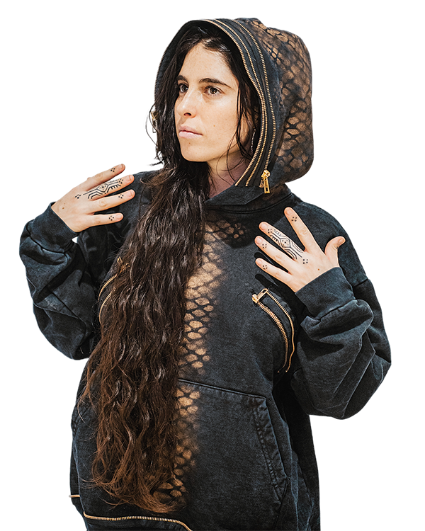 Una sudadera negra unisex que envuelve el cuerpo con fuerza y elegancia, adornada con detalles metálicos dorados que simbolizan la energía solar y la renovación.